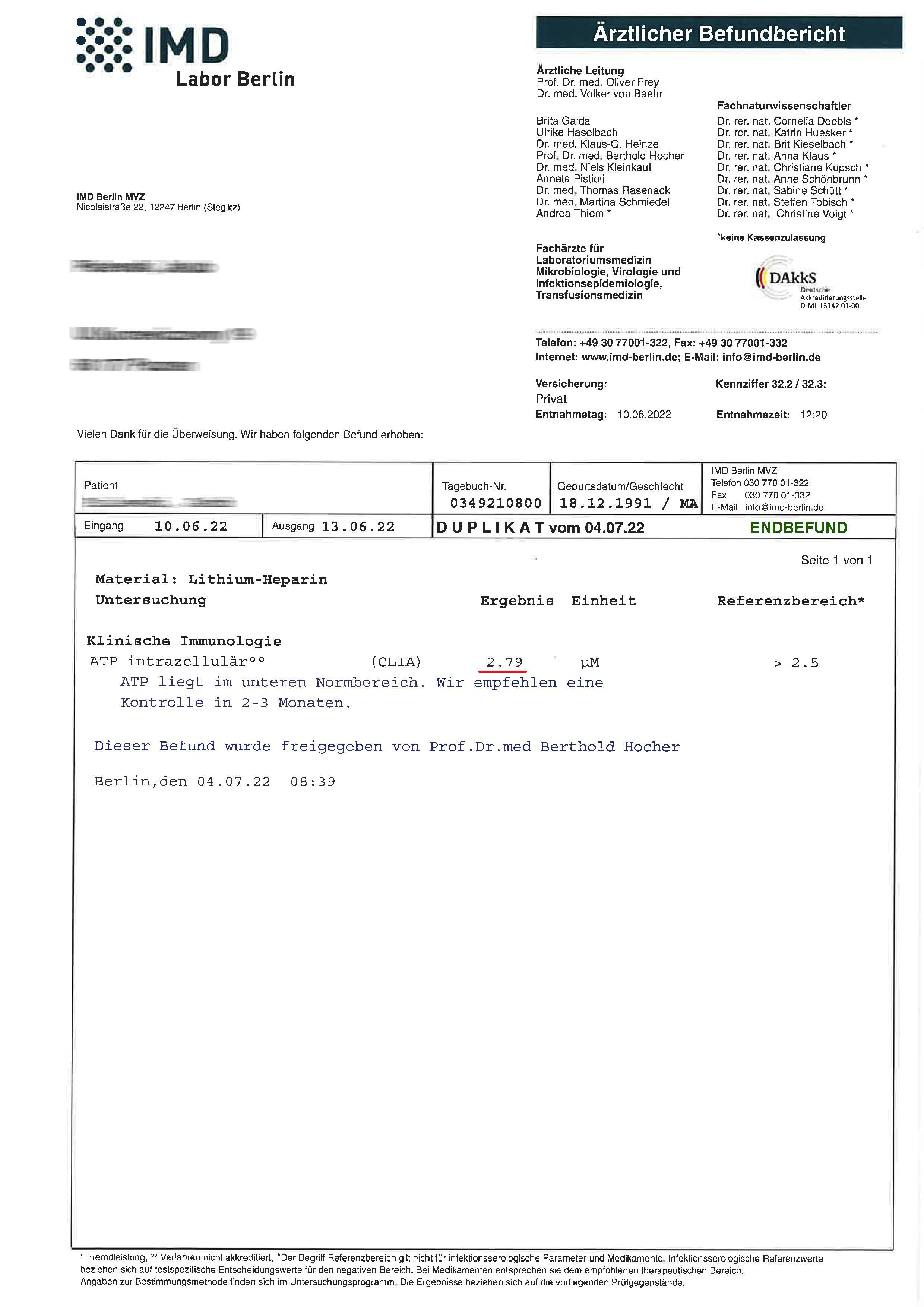 We współpracy z laboratoriami międzynarodowymi, takimi jak IMD Labor (Berlin) i Laborarztpraxis Rhein-Main (Frankfurt), udowodniono podniesiony poziom ATP wewnączkomórkowo o ponad 170% oraz ponad 100% w granulocytach.